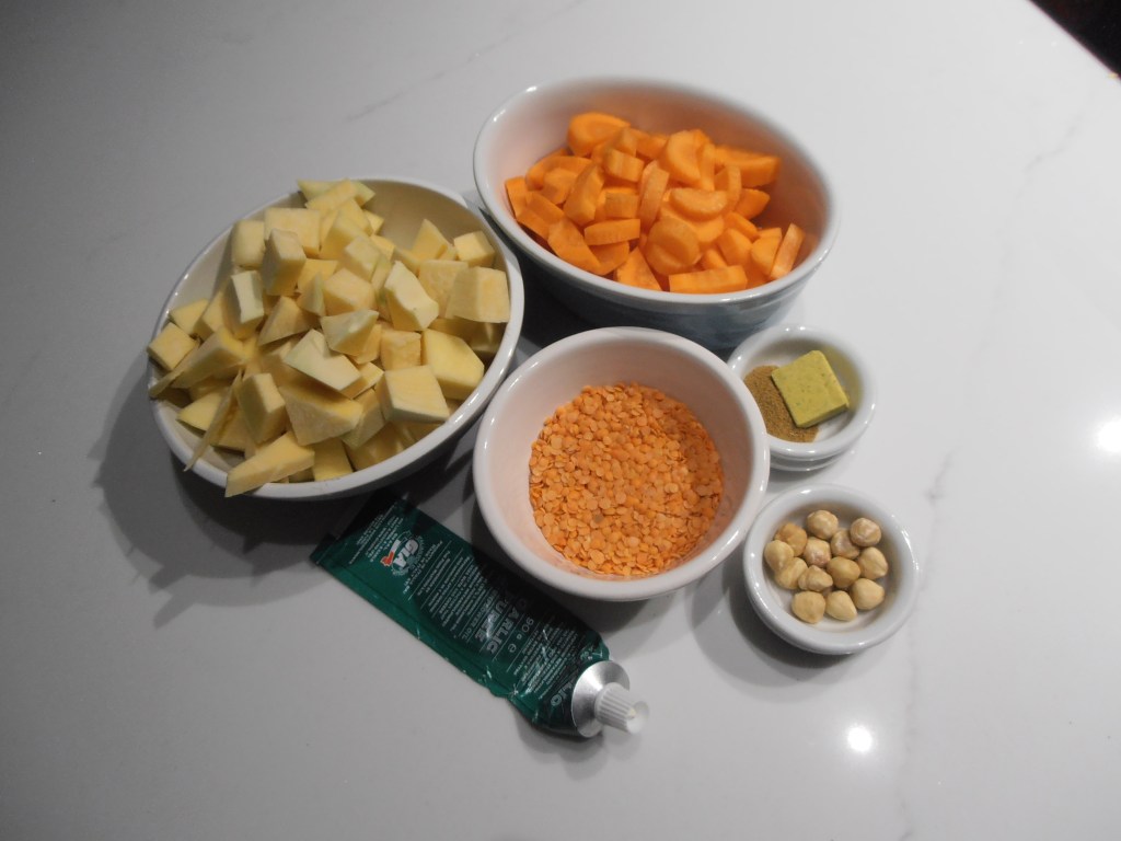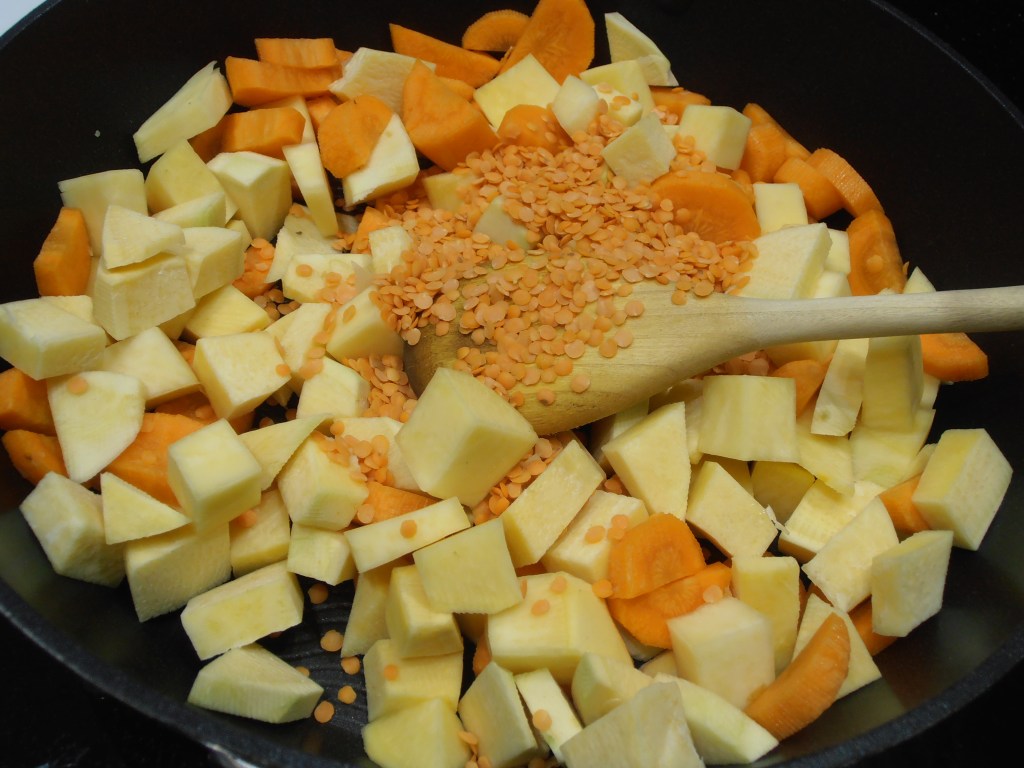 1- Place the garlic, swede, carrots and lentils into a large pan on the heat