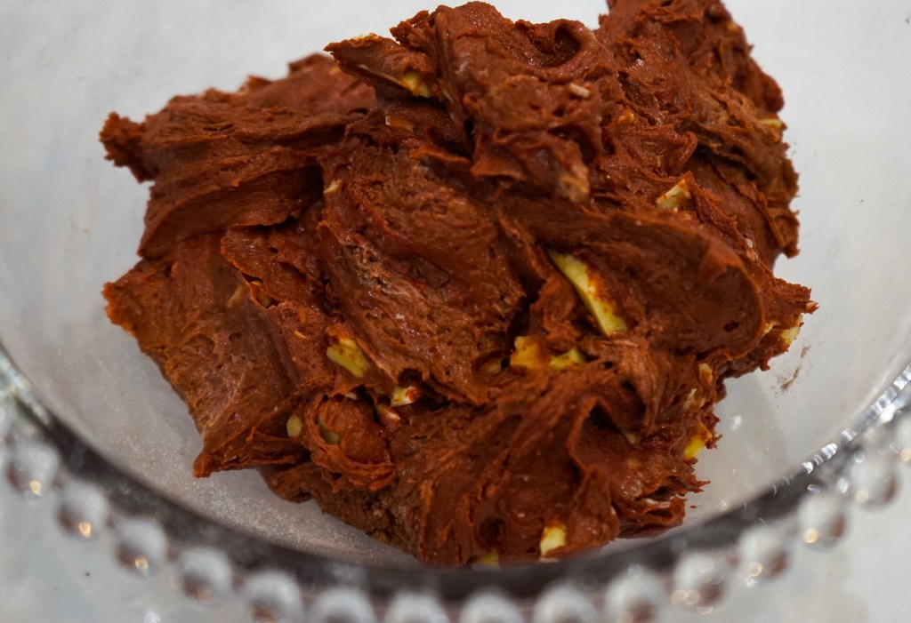 3 – In a separate bowl, beat with egg with the vanilla, yogurt and red paste. Add this to the butter and combine until smooth