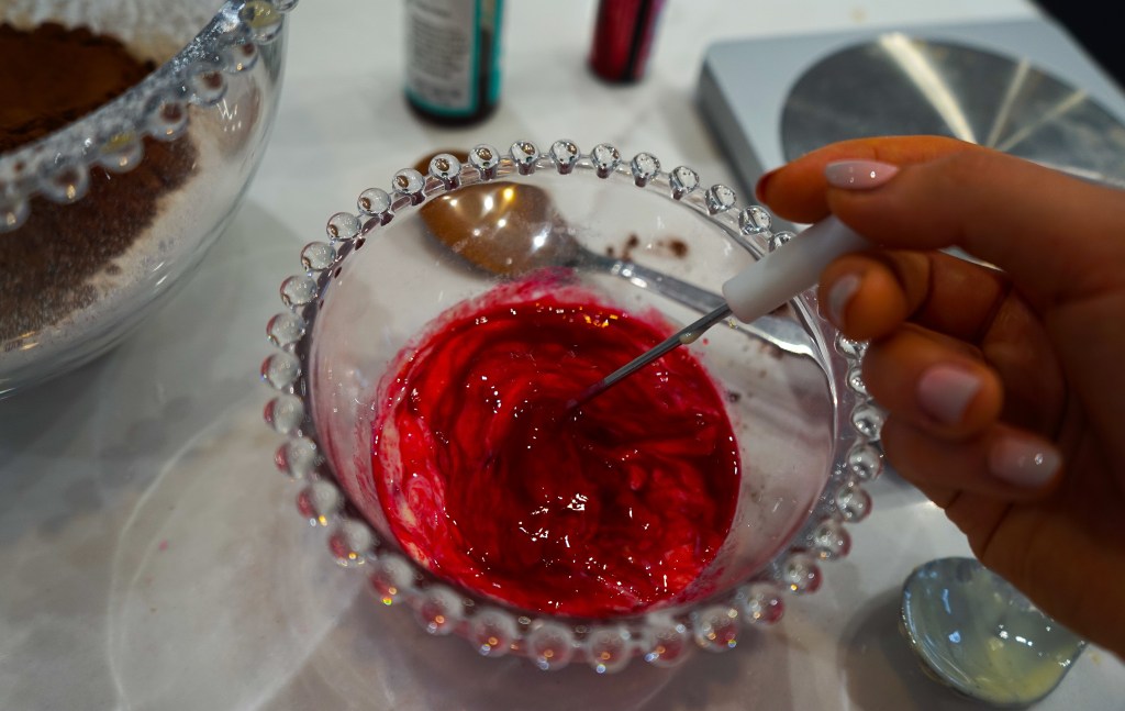 4 – Fold the flour mix in to the ‘red mix’ until combined, before mixing in the white chocolate