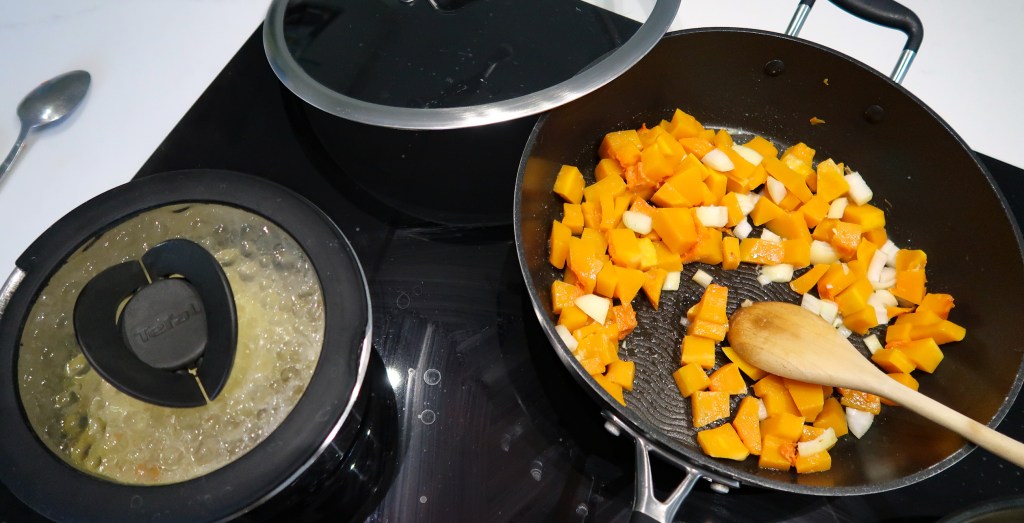 2 – Whilst the squash is softening in the microwave, place the rice, water and stock cube in a saucepan and cook for about 20 minutes (or as per the instructions). By the time this has finished, the rice should have soaked up most of the water and turned gold from the stock cube