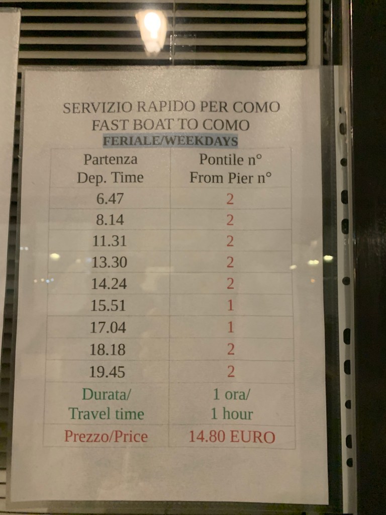 If I recall, this took between an hour and 1.5 hours, where we changed at Saronno (Como to Saronno €2.90, where you need to go to a machine to ‘authorise’ your ticket), before heading to the airport (Saronno to Malpensa airport €8) = seamless!