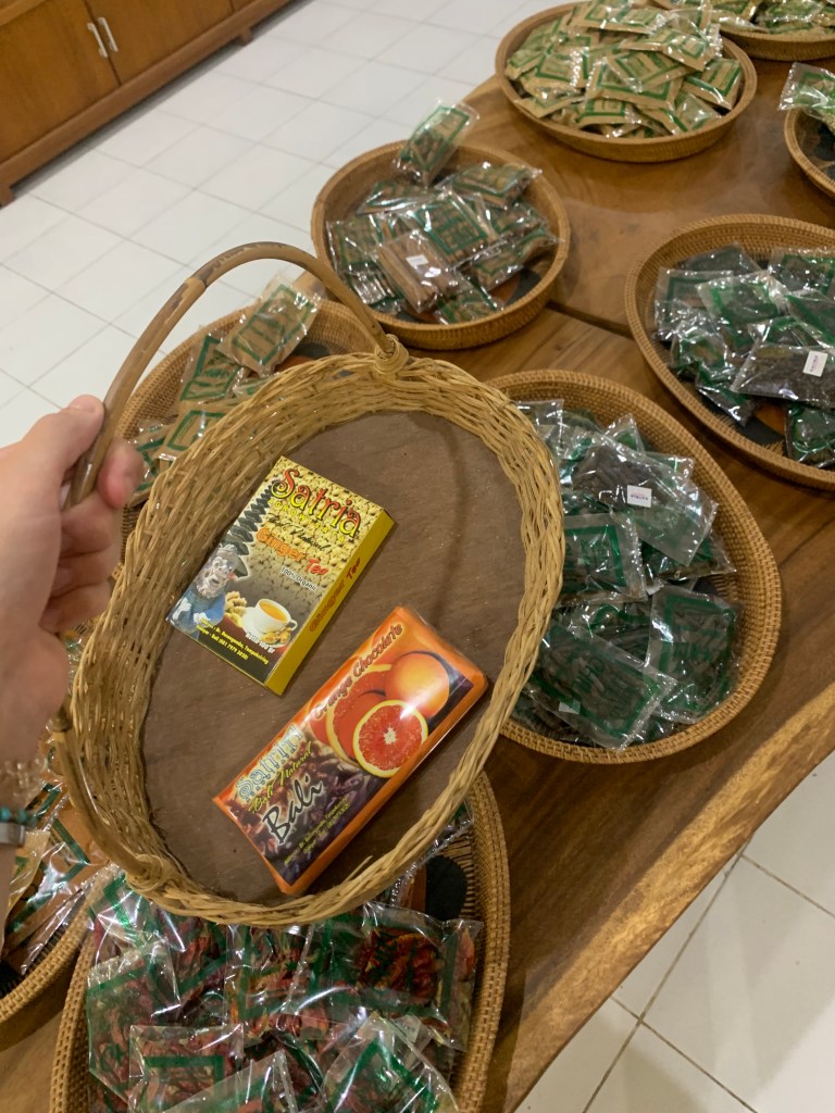 During our visit, we managed to experience coffee and tea tasting – for free! I do like my coffee, so this was a dream, my favourite being the coconut and avocado ones. Regarding tea, I loved the ginger one so much that I got a pack: it was so strong which I love, and has health benefits including helping your gut. I also tried some luwak coffee (50k = £2.70) which was a rather acquired taste. It was okay, but I wouldn’t been in a rush to try it again. All I can compare it to, is it having a sour after taste – fortunately I couldn’t taste poop, not that I’ve eaten poop before to know that… I also grabbed some chocolate orange which is created on the planation, therefore all sales go towards its continued operations. There is no milk in it, so it doesn’t milk. I’m surprised at my self-restraint, where it lasted me for a couple of weeks after coming home! (My purchases and coffee tasting all came to 220k = £11.88).